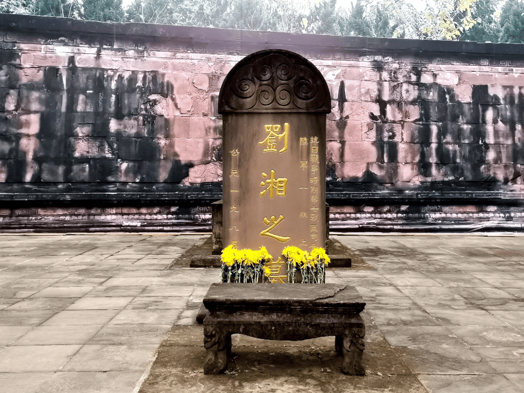 可是,他们带我去武侯祠不过是虚晃一枪,很快把我带到了隔壁的南郊公园,进门是一条庄严的大道;大道两边,幽篁翠柏中,簇拥着四座等距离展开、极具民国风采图案的国字号牌楼。走到尽头,豁然展现出一道孔雀开屏似的彩屏——彩屏之下,是当时国葬的、在抗战中溘然而逝的第七战区司令长官,国民革命军陆军一等上将刘湘的灵柩。