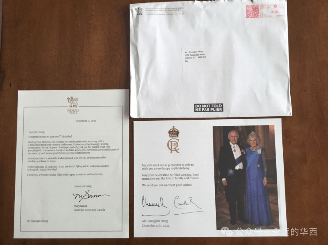 2025年1月初,新年的钟声刚敲响几天,居住在加拿大维多利亚市女儿家的洪光煃先生便收到了一份十分珍贵的特殊礼物——一封来自加拿大总督秘书办公室、于2025年1月2日寄出的信件。洪光煃打开信封一看,里面装着祝贺他105岁生日的一封贺信和一张贺卡:贺卡上印有英国国王查尔斯夫妇照片并有查尔斯国王亲笔签名,而贺信则来自亲笔签名的加拿大总督。
