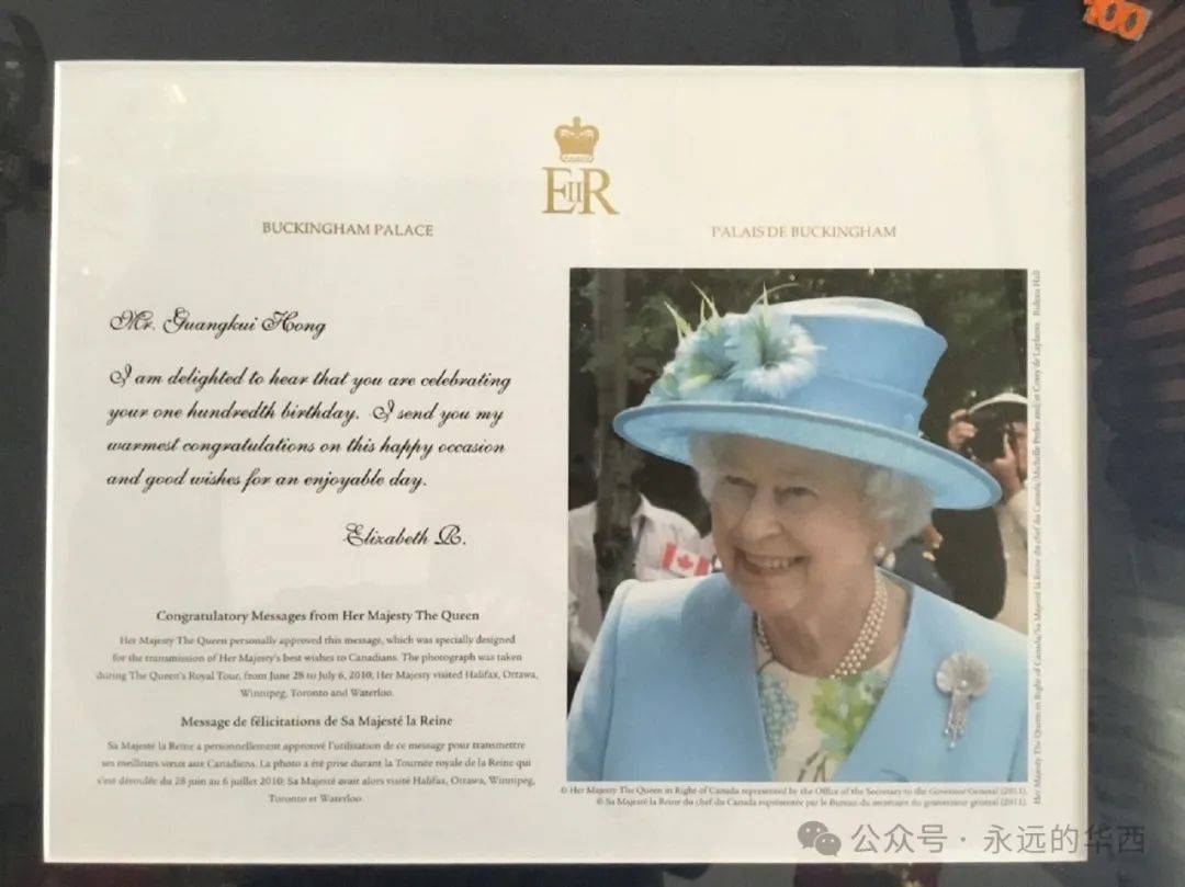 后来我又百度了一下:这一传统活动可追溯到1917年乔治五世统治时期。当时国王会给庆祝100岁生日或60周年结婚纪念日的人发送祝福电报。伊丽莎白二世在位的70年间,大约共送出130万张贺卡至英国和英联邦国家的公民。2022年英女王去世后,查尔斯国王登基并延续了这一传统。仅这一年,他就发送了自己任期内的第一批生日贺卡,数百名老人都收到了来自国王的祝福。洪濂说,她们当初并不知道有这回事,在她爸爸即将年满100周岁的2019年,邻居告诉她们可以申请英女王的生日贺信。她们抱着试一试的心态提出了申请,结果在她爸爸生日时果然收到了女王的生日贺卡。