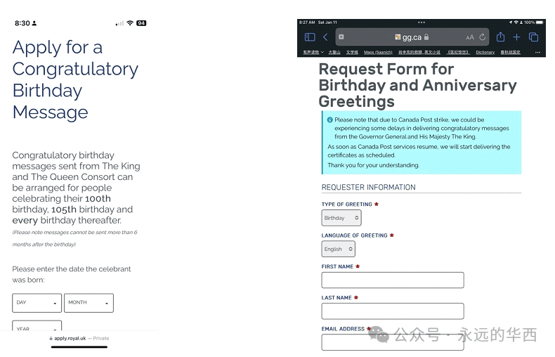 申请程序:由申请人填写申请表后交由总督府统一汇总发往英国,国王签名后返回总督府,最后由总督秘书办公室连同总督的贺信一并寄出。加拿大属于英联邦国家,加拿大总督也会给年满50周岁的加拿大公民发送生日贺信。
