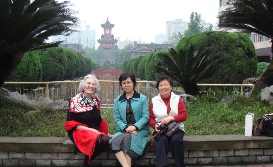 2014年,洪濂(右)与她的加拿大朋友回成都探亲时在华西坝留影(中间是本文作者向素珍)