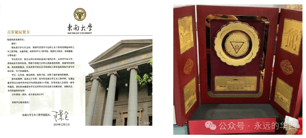 艺术学院副教授张志贤博士为洪光煃学长专门设计了一组独一无二的,包含了校徽、大礼堂、六朝松、老图书馆和老南门等东大元素的百岁生日贺卡。