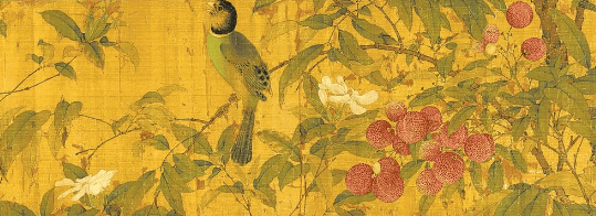 宋徽宗赵佶的《写生翎毛图》是一幅著名的宋代院体花鸟画,画面中心是一株枝繁叶茂、果实累累的荔枝树,绶带鸟、蓝背夜莺、青冠雀、绿绣眼等七只鸟栖于荔枝丛中