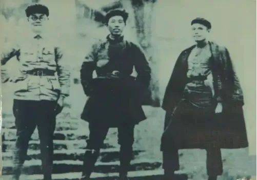 1936年长征期间,吴德峰(左)在贵州黔西县政府大礼堂与王震(中)、张子意合影。
