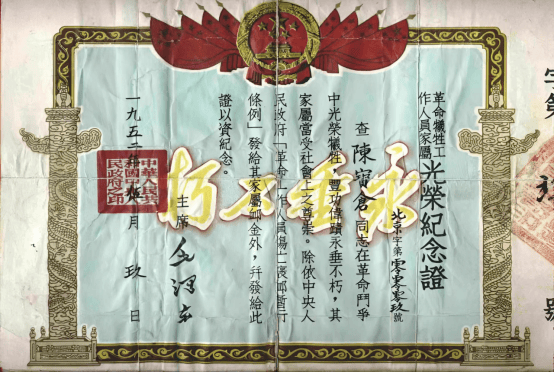 1952年,毛泽东主席亲笔签署颁发了0009号《革命牺牲工作人员家属光荣纪念证》,授予陈宝仓同志革命烈士称号。