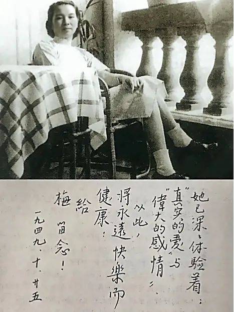 上面是朱枫赴台前一个月的1949年10月25日,从香港寄出给家里的最后一张照片。她坐在阳台上的藤椅中。在铺着方格子桌布的圆桌边,她身着浅色旗袍,微微笑着看向镜头。在照片的背后,朱枫用娟秀的字体写道:“她已深深地体验着‘真实的爱’与‘伟大的感情’,从此,将永远快乐而健康。”