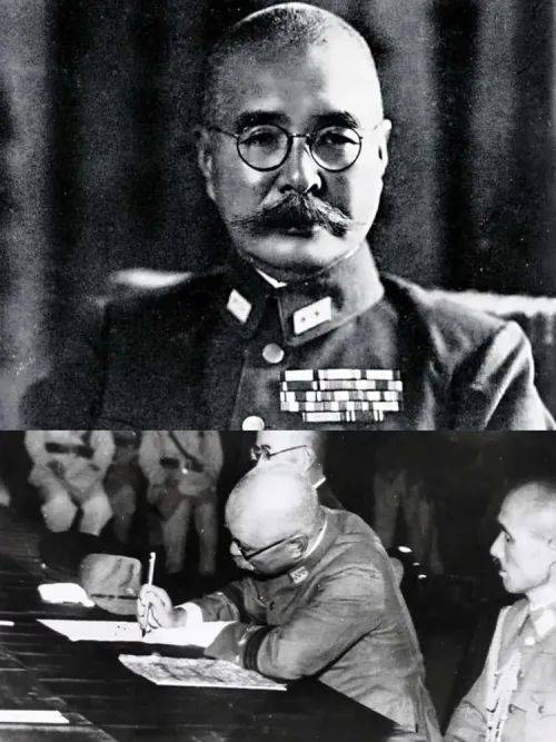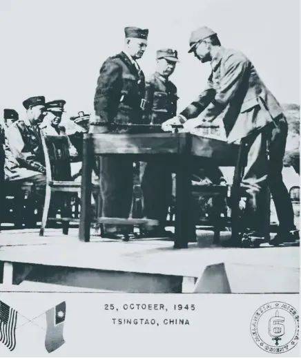 1945年10月25日青岛汇泉跑马场,陈宝仓中将与美海军谢勃尔少将接受日军(代表为长野荣二)投降。