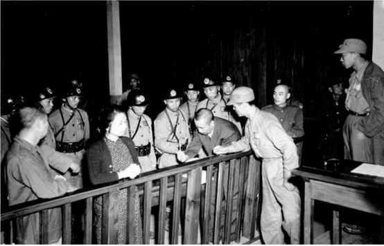3个多月后,1950年6月10日,台湾“特别军事法庭”栏杆前的(上图左起)吴石、朱谌之、陈宝仓(低头写遗书者)、聂曦被国民党当局控以“匪谍”罪,判处死刑。