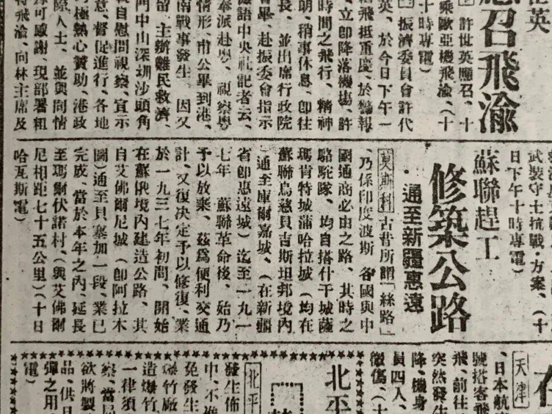 1939年1月,苏联乌兹别克斯坦至我国新疆惠远的公路开通,苏联在报道中也出现了“丝路”一词。《申报》以“苏联赶工,修筑公路,通至新疆惠远”为题转载了来自莫斯科的报道:“古昔所谓‘丝路’,乃系印度波斯各国与中国通商必由之路。其时之骆驼队,均自搭什干城、萨玛肯特城、蒲哈拉城(均在苏联乌慈贝吉斯坦邦境内)通至库尔嘉城(在新疆省即惠远城)。”(“乌慈贝吉斯坦”即乌兹别克斯坦,“搭什干城、萨玛肯特城、蒲哈拉城”即乌兹别克斯坦共和国的塔什干、萨马尔罕、布哈拉城)。由于苏联乌兹别克斯坦和我国新疆都位于丝绸之路的要冲,而“丝路”一名已为中欧学者所使用,苏联方面也使用了“丝路”的名称。