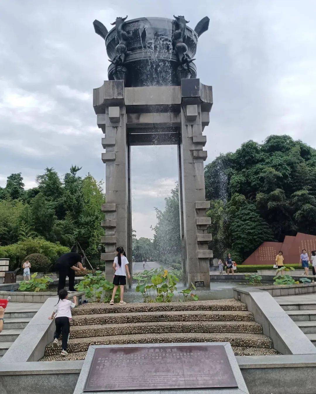从浣花溪公园南门进入,来到万竹广场,首先映入眼帘的是标志性雕塑“源泉”。