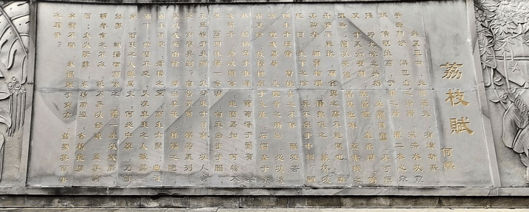 文峰塔公园东面滨江路绿化长廊边,与凌霄阁相邻的就是合州荔枝阁,如今入驻了金丝楠木艺术馆。在荔枝阁的基座上,再现了那篇被世人传诵的《荔枝赋》。