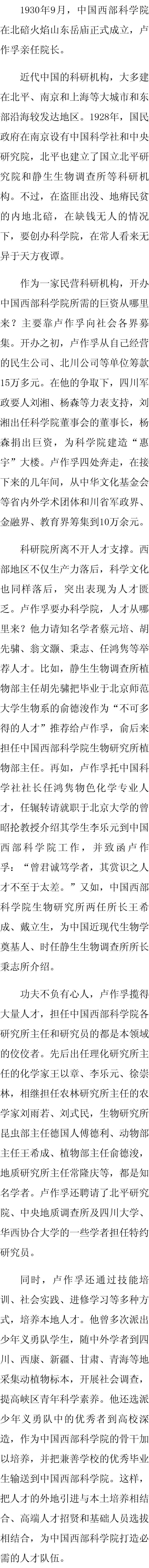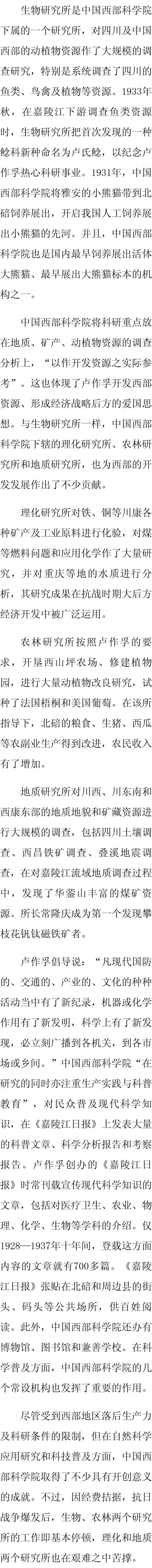 卢作孚为人所熟知的是“爱国企业家典范”“中国船王”“北碚之父”等诸多身份,但对于他为近代科学事业所作出的贡献,人们却知之不多。20世纪30年代初,卢作孚在一穷二白的内地一隅推动了中国西部科学院的崛起和发展。在他的经营之下,北碚这个弹丸之地,在抗战时期吸引了众多内迁的科研机构,神话般地成为大后方的科学中心。
