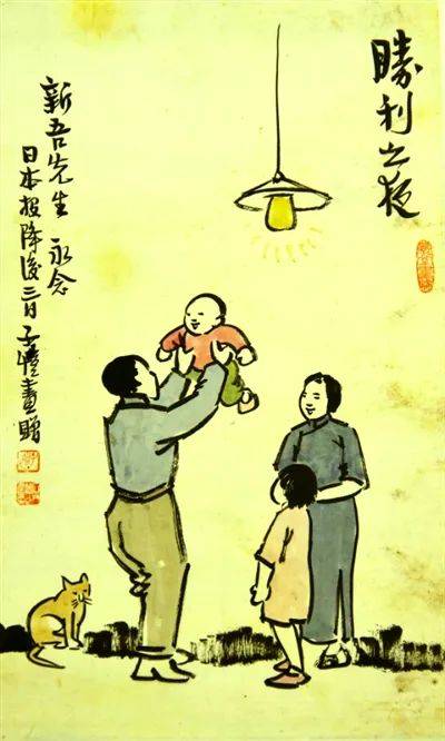 三日后,丰子恺挥毫泼墨,将心潮凝于《胜利之夜》。画中无宏大场景,仅一家四口与一猫,却暗藏深意:父亲举子,喻民族新生;母亲含笑,示坚韧守望;幼子伸手,指未来希望;暖灯照耀,意味光明重现,花猫安卧,象征久违和平。丰子恺常以简淡笔墨包裹生活哲思,此画一反往日风趣,以背身父亲强化情感张力,让观者代入“举杯邀明月”的狂喜。题字“日本投降后三日”,恰是历史的精准锚点。