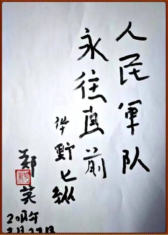 我双眼残疾,左眼失明,右眼只有光感,在连续数小时讲述自己亲历淮海战役的故事后,应邀现场为淮海战役纪念馆题写了“人民军队永往直前”“救死扶伤”两幅字。
