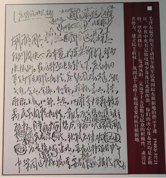 1940年3月21日,毛泽东起草关于动员全体军民巩固皖东根据地的指示:
