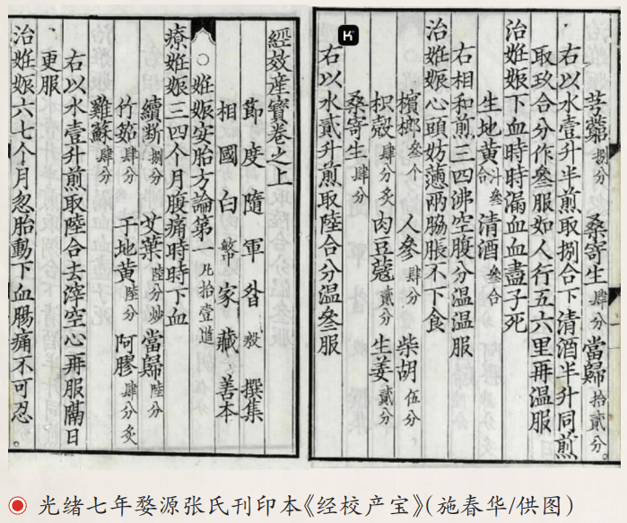 昝殷(797—859),唐代著名妇产科学家。成都人,官医学博士,擅长妇产科和药物学。唐大中年间(847—860)昝殷集有关胎、产、经、带诸症效验方378首,编成《产宝》3卷,续编1卷。现传本作《经效产宝》,是我国现存较早之妇产科专书,专论妊娠、临产、产后三个时期的疾病和治法处方。原书52篇论,371方;今存本共41篇论,374方。其中,卷上列妊娠病12论、产难4论,包括安胎、食忌、恶阻、漏胞下血、身肿腹胀、胎衣不下等妊娠杂病及产难诸疾;卷中、下共列产后25论,阐述产后病证及其防治。续编录周颋的传授济急方论和李师中、郭稽中的“论二十一证”,另有“产后十八论方”。书中对妊娠过程中诸多杂症及产前护理、产后调养进行了较为全面的探讨。书中编例均先述病证,后列方治,清晰明白,较为实用。如其上卷中妊娠安胎方论第一“妊娠三四个月腹痛时下血”方,详细列出了各类药材及用量、服用方法: