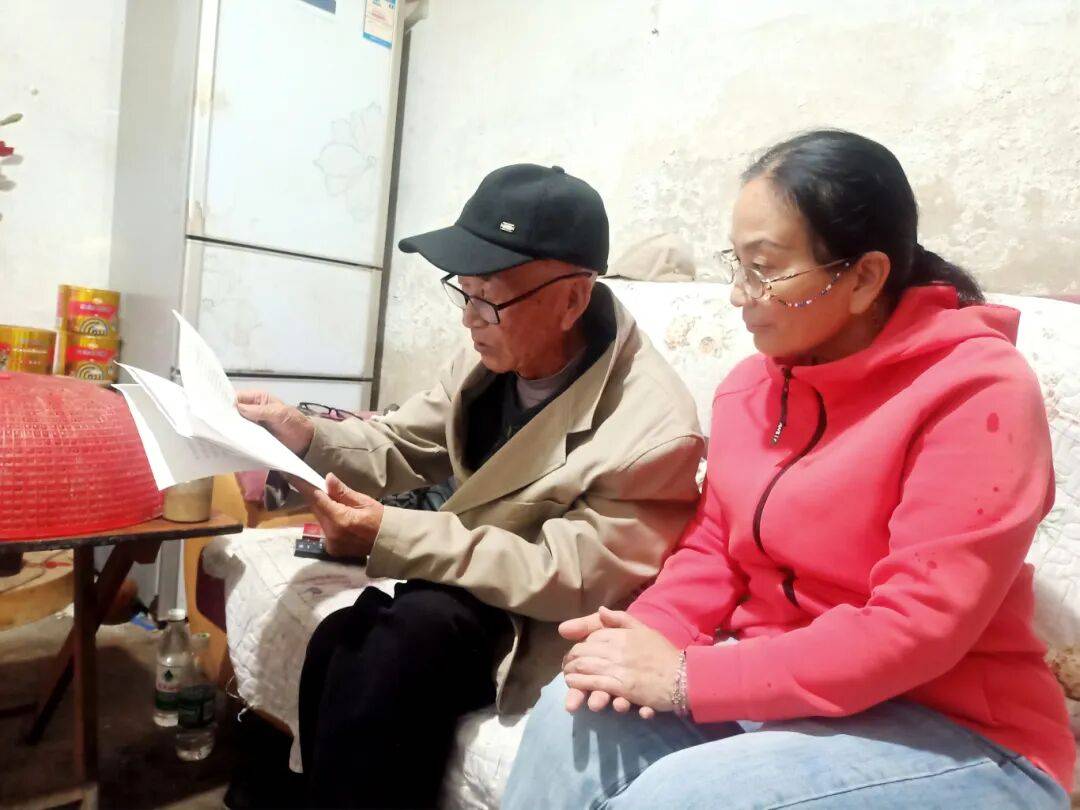 2025年10月7日晚,本文作者蒙琼英(右)拜访王成玉儿子王仁钊并请他审核本文内容(蒙琼英 供图)