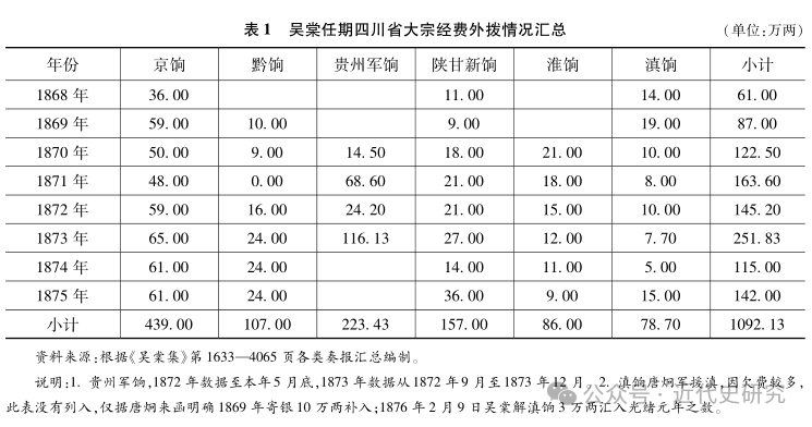 1868年,吴棠到任时间较短,从1869年至1875年七年间的大宗经费外拨支出总数为1031.13万两,平均每年外拨银147万两。考虑到太平天国运动之前四川是每年受协20万两的省份,在该省支出不断膨胀的背景下,这显然不是一个小数目。