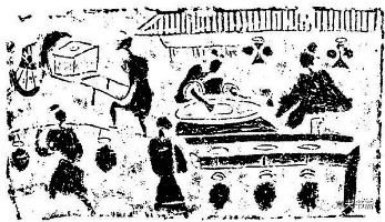 酒肆画像砖展示了当时酒的贸易场景:铺面临街,酒坛累累,店主站在柜内,正在应酬前来沽酒的客人。两位饮客正急匆匆地向酒店走来,图案左下方则是推着独轮车的运酒员。