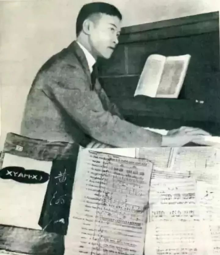 冼星海正在弹奏乐曲,照片下半部分是《黄河大合唱》的曲谱(图片来自网络)