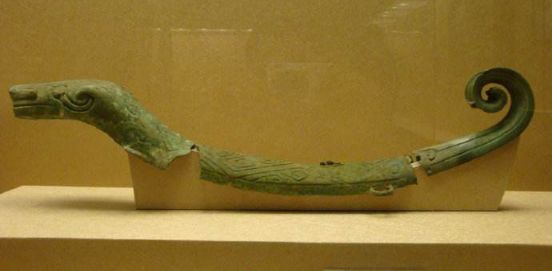 1986年,广汉三星堆2号祭祀坑中发掘出10件铜蛇,身躯大多呈S形,为蟠曲状,头微上昂,头上有耳、长眼,眼球呈圆形凸起,尾上卷。蛇身上刻画着云纹、鳞甲、羽翅,似乎立刻就要腾空飞起。除此之外,还有手持蛇的铜人像。
