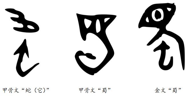 商朝刻在龟甲、牛骨上的文字称为甲骨文,周朝刻在青铜器上的文字,称为“金文”。这些古文字中的“蛇(它)”字和“蜀”字是这样的: