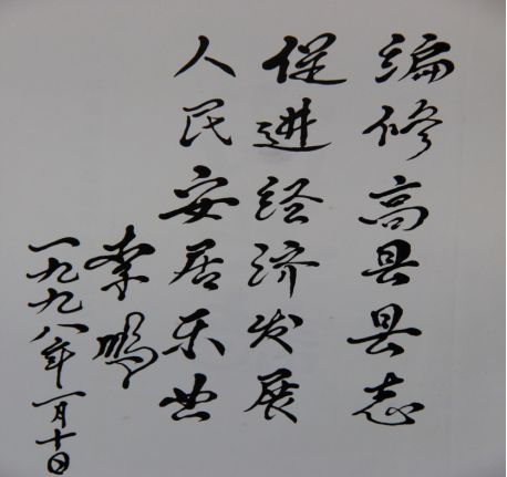 1998年1月10日,李鹏总理为新编《高县志》题词:编修高县志,促进经济发展,人民安居乐业。