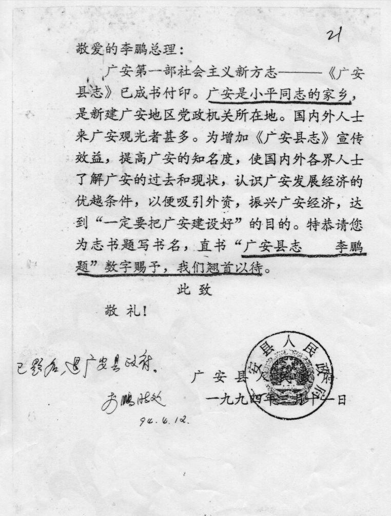 广安第一部社会主义新方志——《广安县志》已成书付印。广安是小平同志的家乡,是新建广安地区党政机关所在地。国内外人士来广安观光者甚多。为增加《广安县志》宣传效益,提高广安的知名度,使国内外各界人士了解广安的过去和现状,认识广安发展经济的优越条件,达到“一定要把广安建设好”的目的,特恭请您为志书题写书名,直书“广安县志 李鹏题”数字赐予,我们翘首以待。