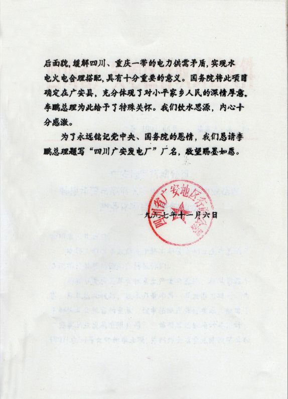 广安发电厂一期工程正在加紧建设过程中,广安地区行署为了永远铭记党中央、国务院的恩情,于1997年11月6日向总理办公室报送《四川省广安地区行政公署关于敬请李鹏总理为四川广安发电厂题写厂名的请示》(广署〔1997〕43号),恳请李鹏总理题写“四川广安发电厂”厂名。请示中写到:“四川广安发电厂的建设,对于改变广安地区贫困落后面貌,缓解四川、重庆一带的电力供需矛盾,实现水电火电合理搭配,具有十分重要的意义。国务院将此项目确定在广安县,充分体现了对邓小平家乡人民的深情厚意,李鹏总理为此给予了特殊关怀。我们饮水思源,内心十分感激。”