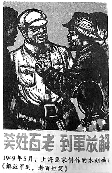 1949年5月,上海画家创作的木刻画:《解放军到,老百姓笑》