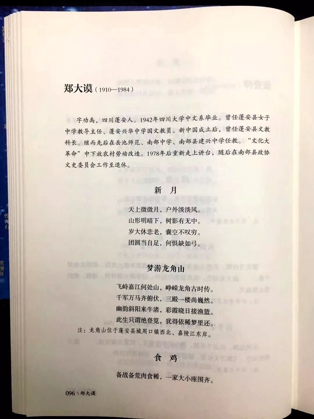 《郑大谟诗词集》的作者郑大谟(1910—1984),字功禹,蓬安周口镇人。1942年四川大学中文系毕业。曾任蓬安县女子中学教导主任、蓬安兴华中学国文教员。中华人民共和国成立后,曾任蓬安县文教科长。继而先后在岳池师范、南部中学、南部县建兴中学等校任教。因所谓政治历史问题,在历次运动中皆遭受冲击。“文化大革命”伊始,即下放农村“劳动改造”,1978年后重新走上讲台,随后在南部县政协文史委员会工作至退休。其诗稿 3000 余首,大多散佚,现存者不足半数。