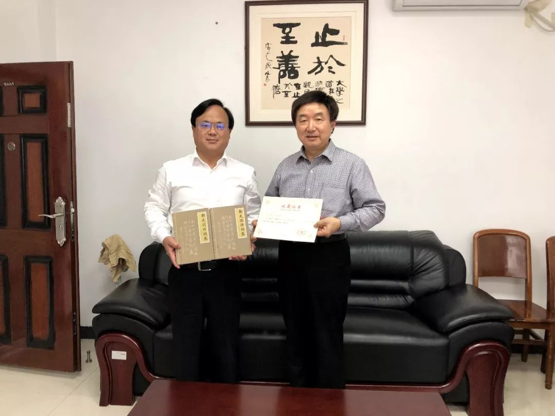 四川师范大学图书馆收藏《郑大谟诗词集》。图为赵义山教授(右)与四川师范大学图书馆馆长曹成建合影(赵义山 供图)