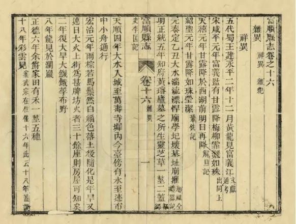富顺县地处四川盆地南部,属亚热带湿润季风型气候区。沱江由北向南纵贯全境,沿江两岸沟壑纵横,形成大小溪河300余条。自有资料记录以来,县境易发冬干、寒潮、伏旱、高温、暴雨、洪涝、风雹等自然灾害,又因受旧社会的政治经济状况和医疗卫生条件等种种限制,这些天灾常常与人祸并行,在富顺历史上曾引发数十起饥荒和瘟疫,给当地百姓的健康与生命带来不可估量的损失。据清同治《富顺县志·灾祥》载:“尧灾汤旱,非尽降祥。气数所至,不异帝王。弥缝天变,爕理阴阳。灾不为害,上格彼苍。庆云甘露,瑞气载阳。五行顺轨,帝道遐昌。”由此看来,灾异与吉祥在古人眼里是天地之常经,古今之通义,就连圣明之主也无法改变。