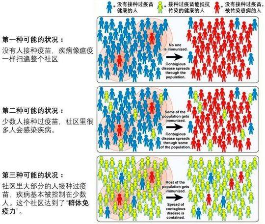 群体免疫力是指人群对传染病的抵抗力。每一种传染性疾病都有自己的基本传染数(R0),基本传染数指的是在人群都对其没有免疫力的情况下,一个感染这种病的人平均可以传染多少人。比如,SARS的R0值是2~5,这就意味着一名SARS病毒携带者可以感染2~5名健康人。R0值越大,这种疾病就越容易传播。想要获得群体免疫力,人群中能产生免疫应答的人数就必须达到一定比例,这样才能阻止病毒的传播,控制疾病的蔓延。这个比例用“人数×(11/R0)”来计算。拿季节性流感来说,其R0值在1.28左右,那么100人的群体中对流感免疫的人至少要达到22[100×(11/1.28)≈22]人,才能阻止病毒的传播。群体中获得免疫的人越多,越能阻止病毒的侵入。试想当99人都对流感病毒免疫时,携带流感病毒的那个人就不会感染其他人了。