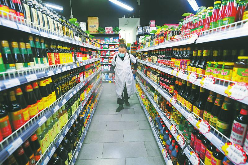 成都益民菜市东苑店内,保洁人员进行消杀、清洁。本报记者肖雨杨摄