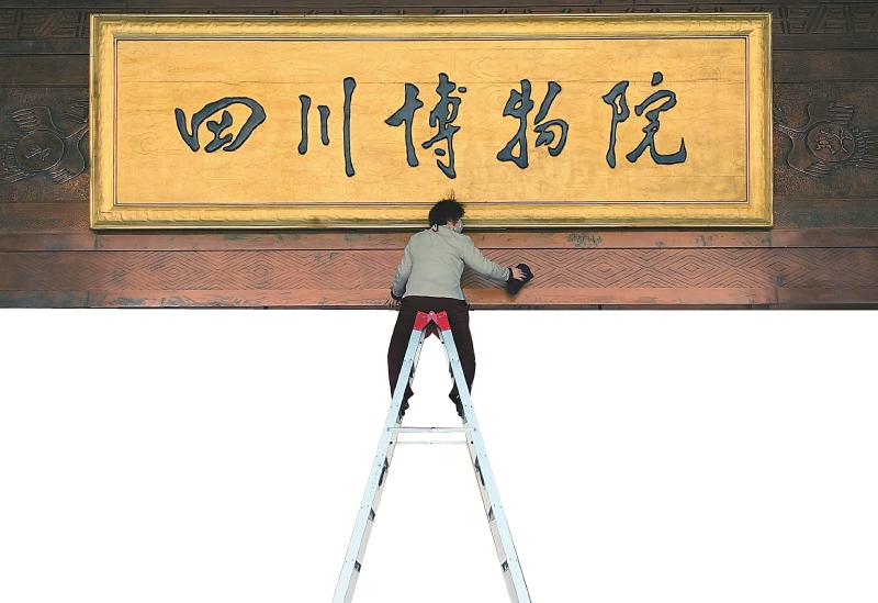 四川博物院保洁人员正在清洁门厅入口。本报记者肖雨杨摄
