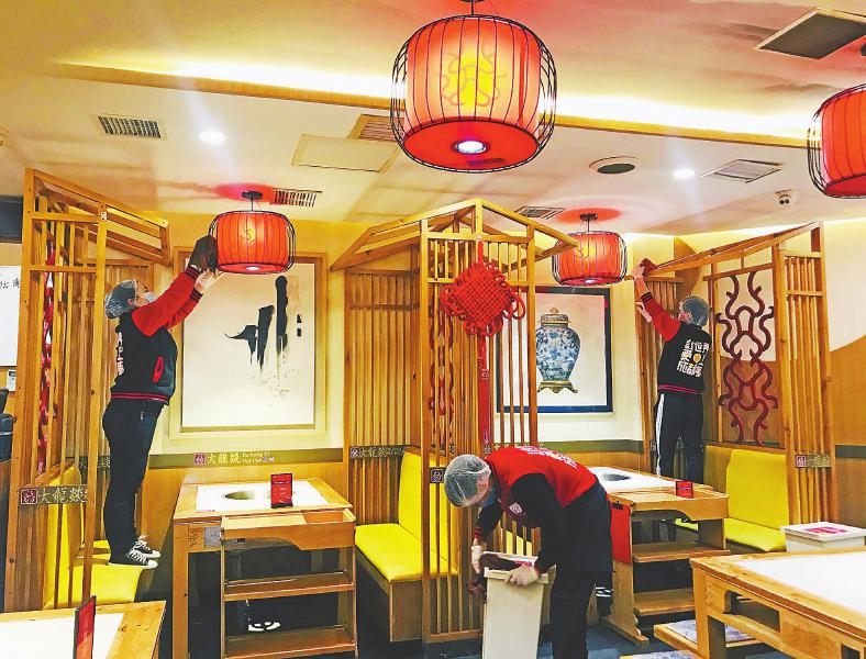 ④成都大龙燚火锅科华店,员工对门店进行清洁。本报记者肖雨杨摄