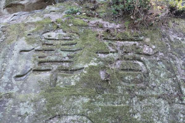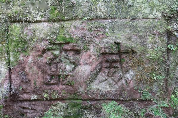 题刻,在“大堂坝”后方天然崖壁上。不过这些碑刻都不是当年蒙元驻军留下的。现存四方,其中两方为题刻,另两方为墓碑记。第一幅“普泽”,隶书,阴刻,二字由左至右,字径105厘米。第二幅“威灵”,楷书,位于“普泽”题刻下方,字径20厘米。第三幅《重修墓碑记》,碑宽约167厘米、高约115厘米、底部进深4.5厘米。额上横向楷书“重修墓碑记”,碑左右两侧楷书对联:“生成山水多情趣”“□□□冠有□□”。墓碑为陈氏清末子孙为其入蜀始祖重修墓碑时所刻。第四幅《山□水秀》,碑上方为圆拱形,碑宽120厘米、高167米,底部进深14厘米。碑文大多风化无法识读,仅知其为陈氏在清乾隆十八年(1753)刊刻。