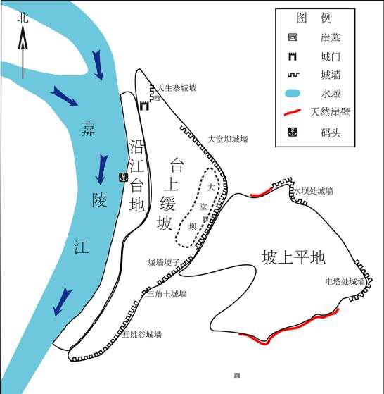 武胜城遗址坐落在今武胜县旧县乡场及其场后山坡上。根据地形地貌可分为沿江台地、台上缓坡、山顶平地三个部分,由嘉陵江边向武胜山顶延伸。这种地形在战争时期便于观察和防守,但到和平时代对治理民事则很不方便,于是衙署、民居等十分自然地由山上向山下转移。明洪武四年(1371),明军完成对巴蜀地区的占领,恢复设置定远县,此时的县治已明确“在河东十里武胜山下”的嘉陵江边。以江边台地为县城,虽然方便物资运转和人员出入,但一直面临水患危害。“江水坏庐”成为定远官府无法解决的问题,多任知县曾提出迁徙县城。明嘉靖三十年(1551),知县胡濂在定远官绅支持下终于把县城迁至庙儿坝,即今武胜县中心镇。一度辉煌、繁华的武胜城从此逐渐被废弃。