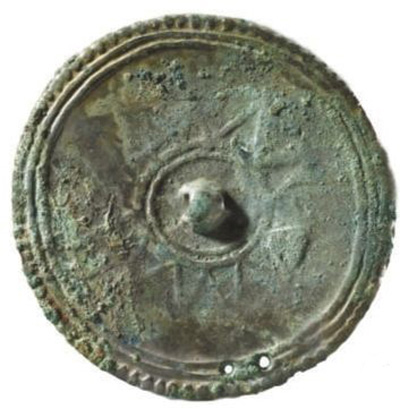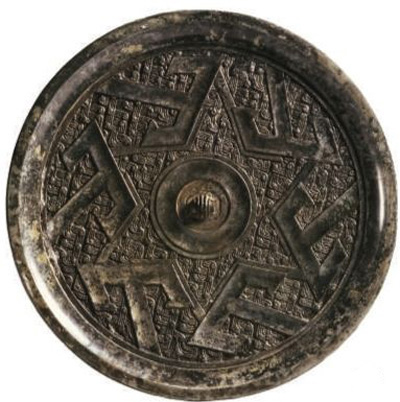 星纹镜是目前发现时代最早的铜镜之一,属于齐家文化晚期,即公元前2000年左右。齐家文化铜镜以星纹为装饰,图案拙朴,镜缘处有两个小孔,具有早期铜镜的特征(图①)。铜镜在甘肃、青海地区的齐家文化出现后,首先在与甘青地区生态环境相同的今长城沿线地区传播;此后,大约在商代晚期传入黄河中下游的中原地区,向西传到天山东部的哈密、吐鲁番一带。