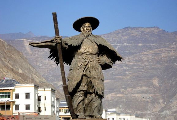 在山东出土的汉画像石上,大禹的形象正是一手执耒耜,一手作手势,与青铜像类似。