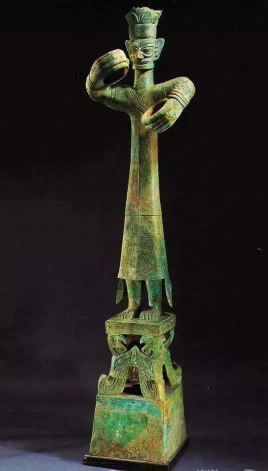“神主”大禹,“东方巨人”。三星堆最大的青铜立人像,身高1米7左右,连座通高2.62米,重180公斤,在国内出土的夏商周文物中,尚属首例。头顶花冠,河目海口,身躯瘦高,一袭长衫细布礼服,手臂和手粗大,两只手呈抱握状。