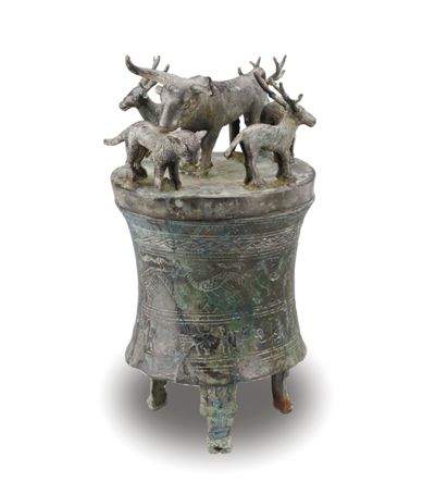 正因它是废物利用,所以器身、大小及花纹都和原来的铜鼓一样,只是个别器物上增加了一些线刻图案和附加装饰。铜鼓形贮贝器后配的盖上均有生动的人物和动物立体雕铸图像,就人物活动场面而言,有祭祀、战争、纺织、纳贡等,真实地反映了滇国社会生活的各个方面。