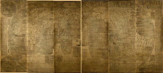南京博物院所藏《坤舆万国全图》,长380.2cm,宽168.7cm,是明朝万历三十六年(1602年)宫廷彩色摹绘本。作为中国第一幅完整的彩绘经纬世界地图,它以当时西方世界地图为蓝本,改变了当时通行的将欧洲居于地图中央的格局,依据中国传统理念,把中国尽量放在世界地图中央(我们今天的世界地图至今沿袭了这样的绘制格局)。全图共6幅条屏,内容分作三部分:主图是椭圆形的世界地图、四个角的天文图和地理图以及题跋解释说明的文字,是当时世界上内容最全、最为科学、最为精确的世界地图。