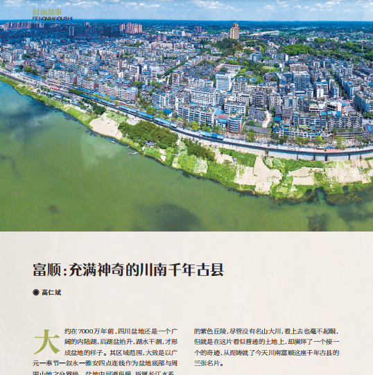 大约在7000万年前,四川盆地还是一个广阔的内陆湖,后湖盆抬升,湖水干涸,才形成盆地的样子。其区域范围,大致是以广 元—奉节—叙永—雅安四点连线作为盆地底部与周 围山地之分界线。盆地内河道纵横,皆属长江水系。在这众多纵横交错的河流中,源出龙门山余脉之茶坪山(古称湔山或玉垒山)东侧的沱江(古称湔水),由成都平原北部至金堂,一路往南,经过内江之后,在泸州汇入长江。而从内江到泸州,沱江水域在这里绵延了100 余公里,古称“雒水”,亦名“釜江”。这段水域流经的地区,大部分都在富顺县范围内,这片靠近北纬30°的紫色丘陵,尽管没有名山大川,看上去也毫不起眼,但就是在这片看似普通的土地上,却演绎了一个接一个的奇迹,从而铸就了今天川南富顺这座千年古县的三张名 片。