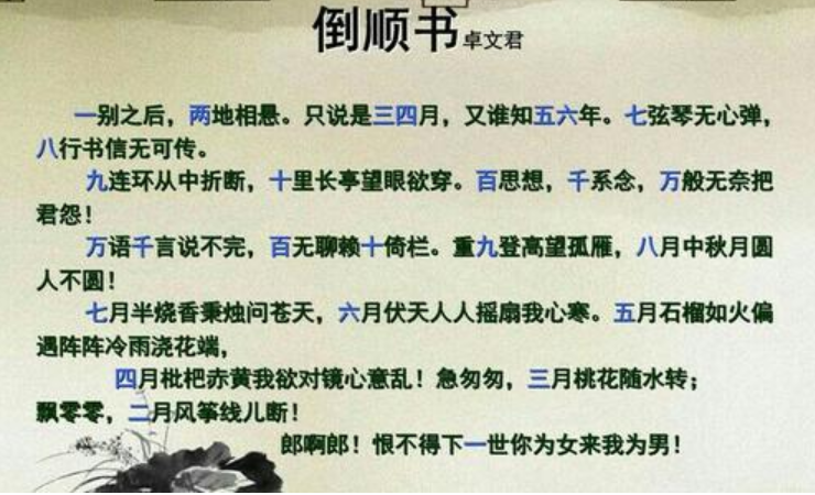 卓文君接信,看见在“万”字后,少一个“亿”字,心如刀割、泪眼婆娑。“无亿”即“无意”,丈夫对自己已然“无意”的暗示。强忍悲痛,回了一封“倒顺书”——《怨郎诗》。