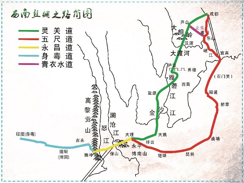 元狩元年(前122年),钦命张骞由“北方丝绸之路”,再次出使西域,直达欧洲大陆,寻找贸易通道,惊奇地发现连长安也殊难见到的蜀地特产,蜀锦、邛竹杖、苎麻麻布、铁器等,在地中海沿岸比比皆是,仰身长叹,原来在我之前已有人捷足先登。“吾贾人往市之身毒国(印度)”,断定西南有一条通往印度的隐秘商道——“蜀身毒道”。