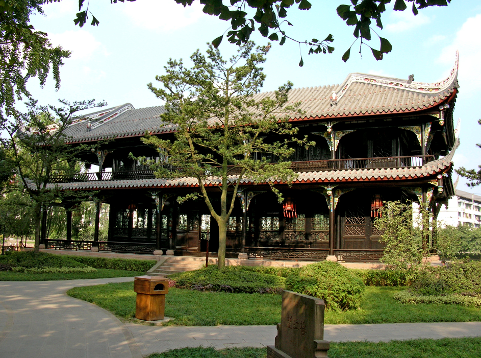 濯锦楼,成都望江楼公园古建筑之一,始建于清嘉庆十九年(1814年),后毁于兵燹,光绪十五年(1898年)重建,因此楼布局与锦江(古称濯锦江)平行,故名“濯锦楼”。相传此楼是后人为纪念薛涛,再现其载酒船上,送别元稹、白居易、刘禹锡等诗人依依不舍的情景而建,所以外形酷似画舫。濯锦楼为全木结构,三楹两层,四面格门窗花,楼内各柱雕有五彩点金的“二十八星宿”,柱上撑拱为云龙透雕,整座建筑玲珑空透。