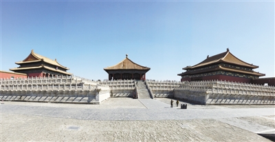 紫禁城古建筑一般坐落在高高的台基之上。台基凸立于地面之上,有利于建筑本身的稳定及建筑防潮。紫禁城前朝三大殿(太和殿、中和殿、保和殿)的台基做法为我国古建筑台基工艺的最高等级,即采用三层须弥座叠加而成,俗称“三台”,总高度达8.13米。由于台基的核心材料为土,为避免雨水渗入台基内部造成土体松散,台基排水极其重要。