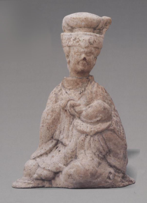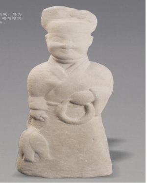 男女佣中的跪坐女佣雕刻细腻,面容、衣着等明晰。现存德阳市博物馆的二级文物跪坐女佣,细眉圆眼,高鼻小嘴,丰腮双颌,面容端庄慈祥,为一中年妇女。头戴披风帽,着二重衣,外衣为对开襟长服,卷袖,双手下垂置于腹前,双足曲跪,坐于地。